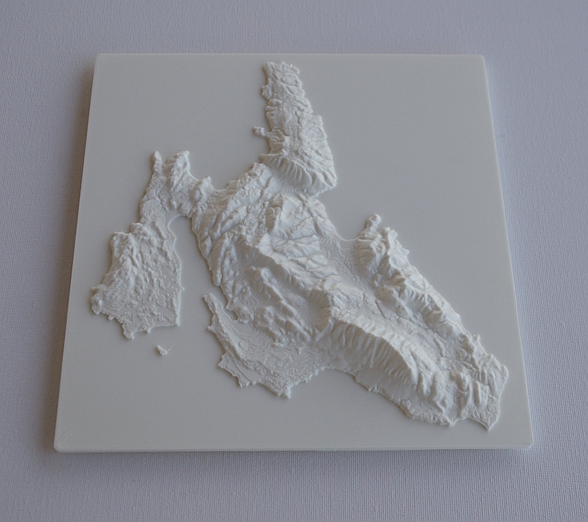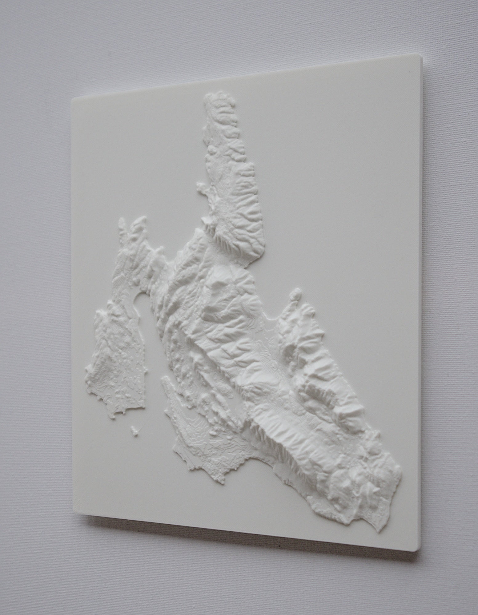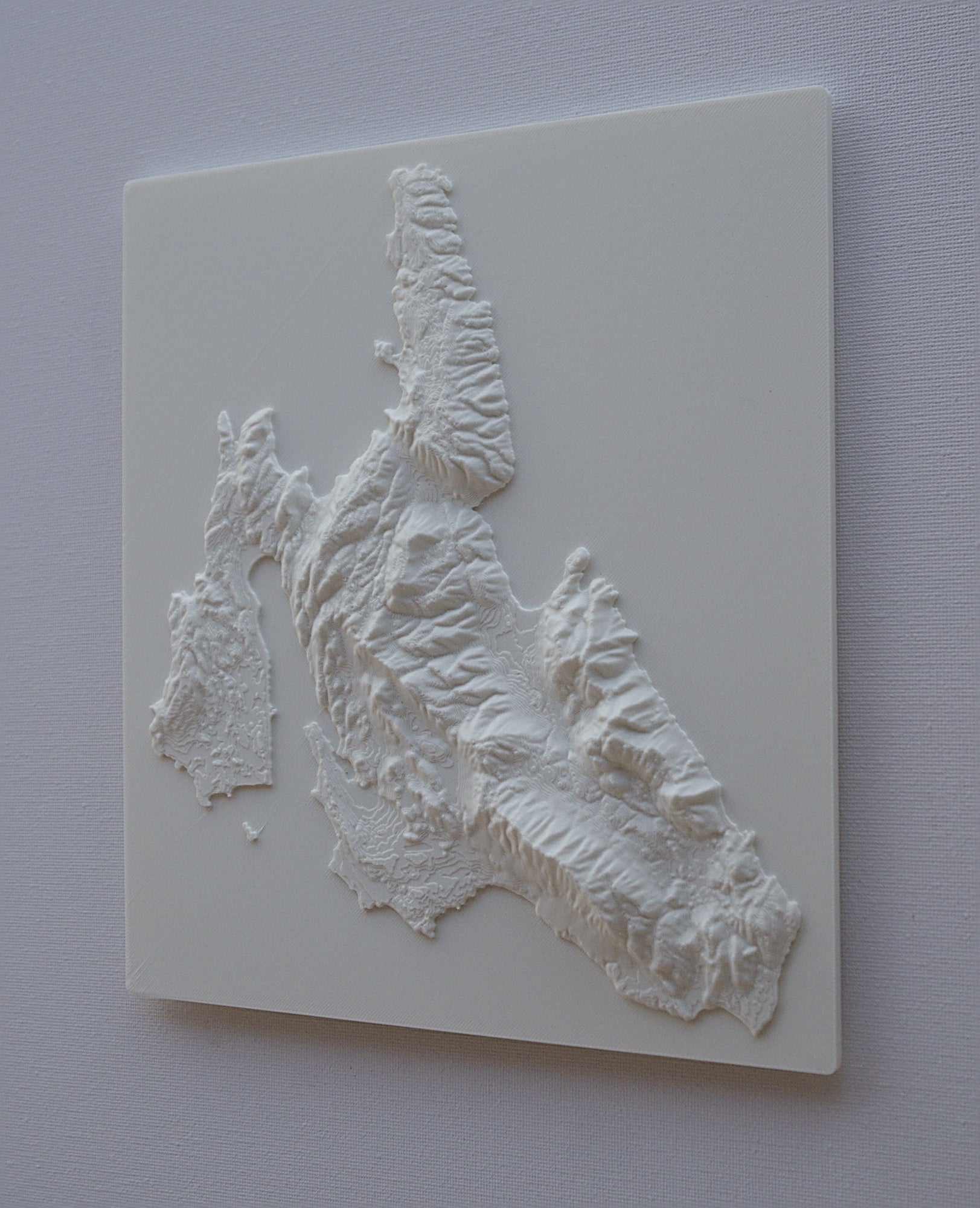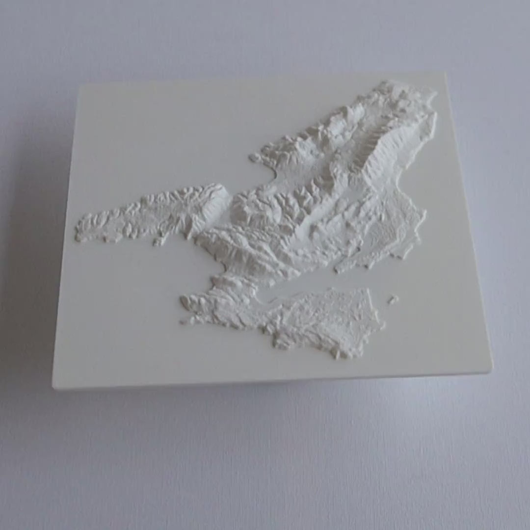 3D printed wall hanging geographical model of cephalonia with a custom attachment for easy wall mounting.