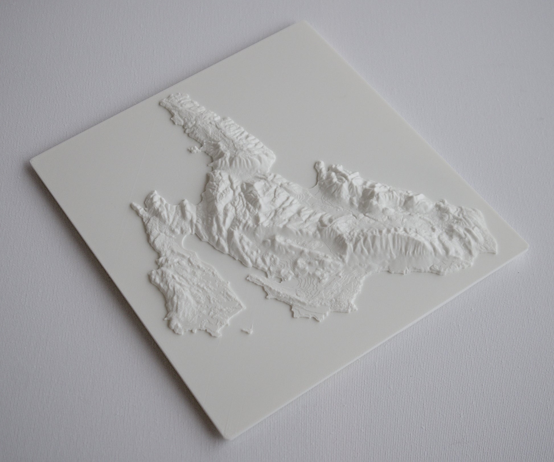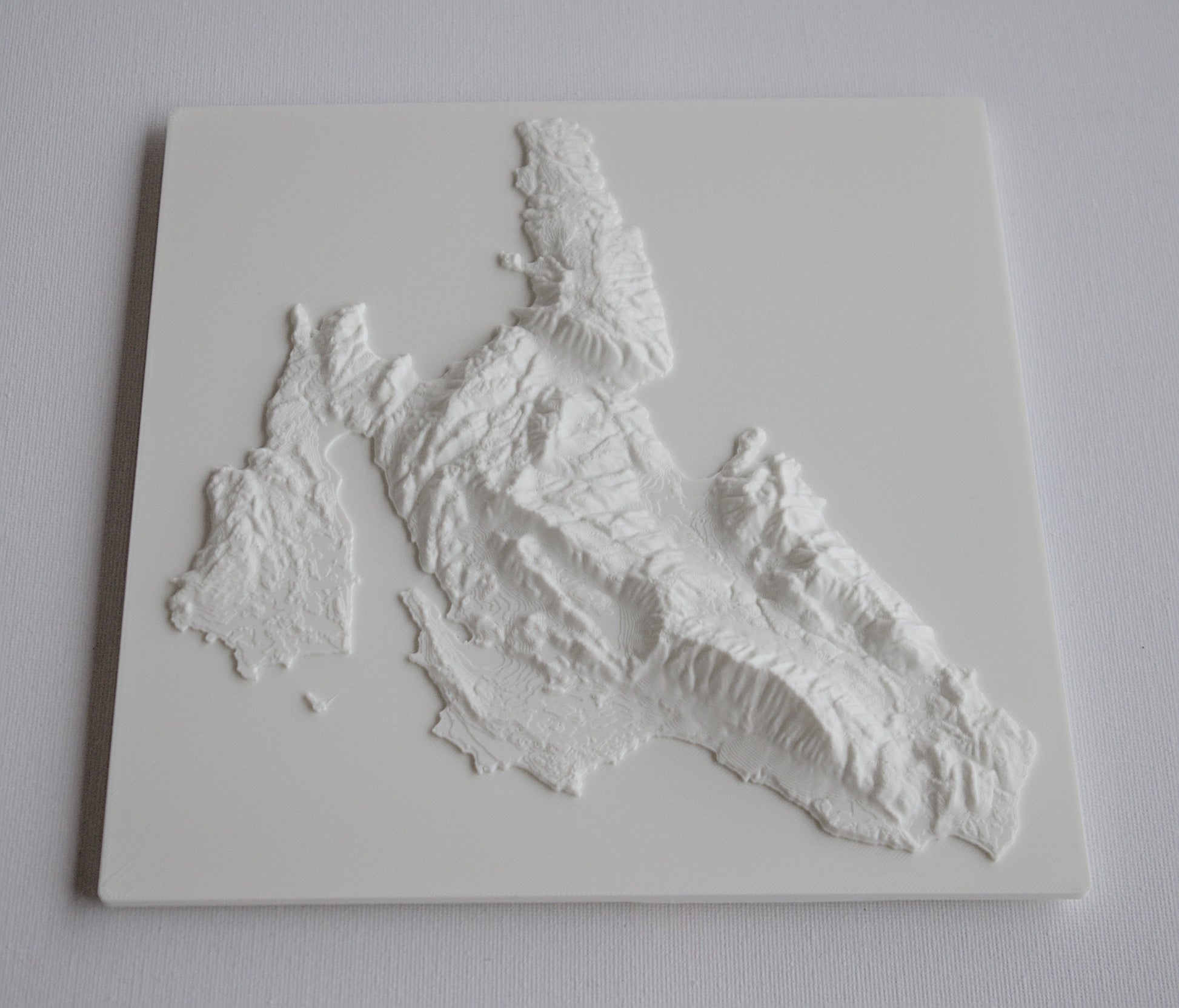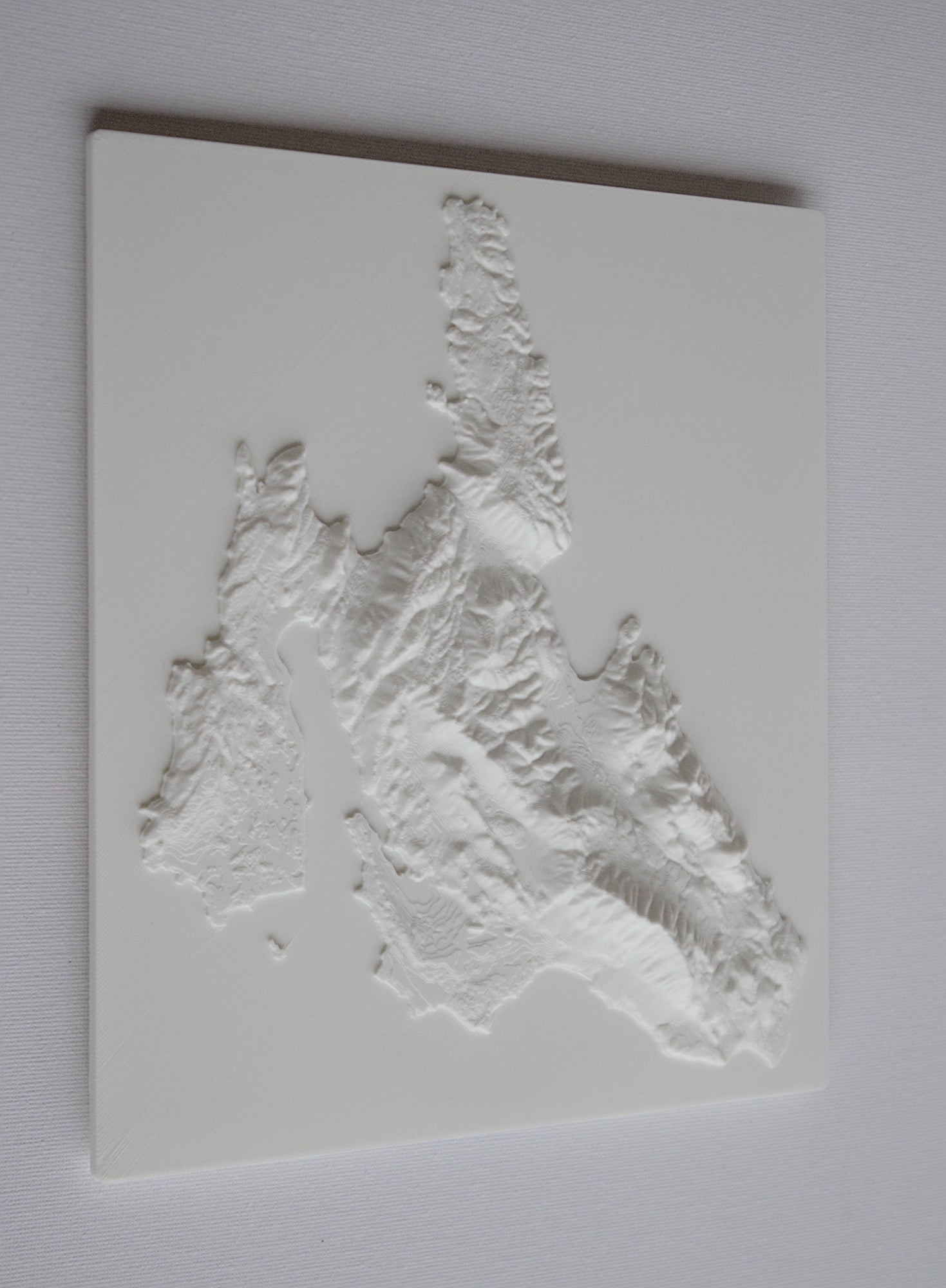 3D printed wall hanging geographical model of cephalonia with a custom attachment for easy wall mounting.