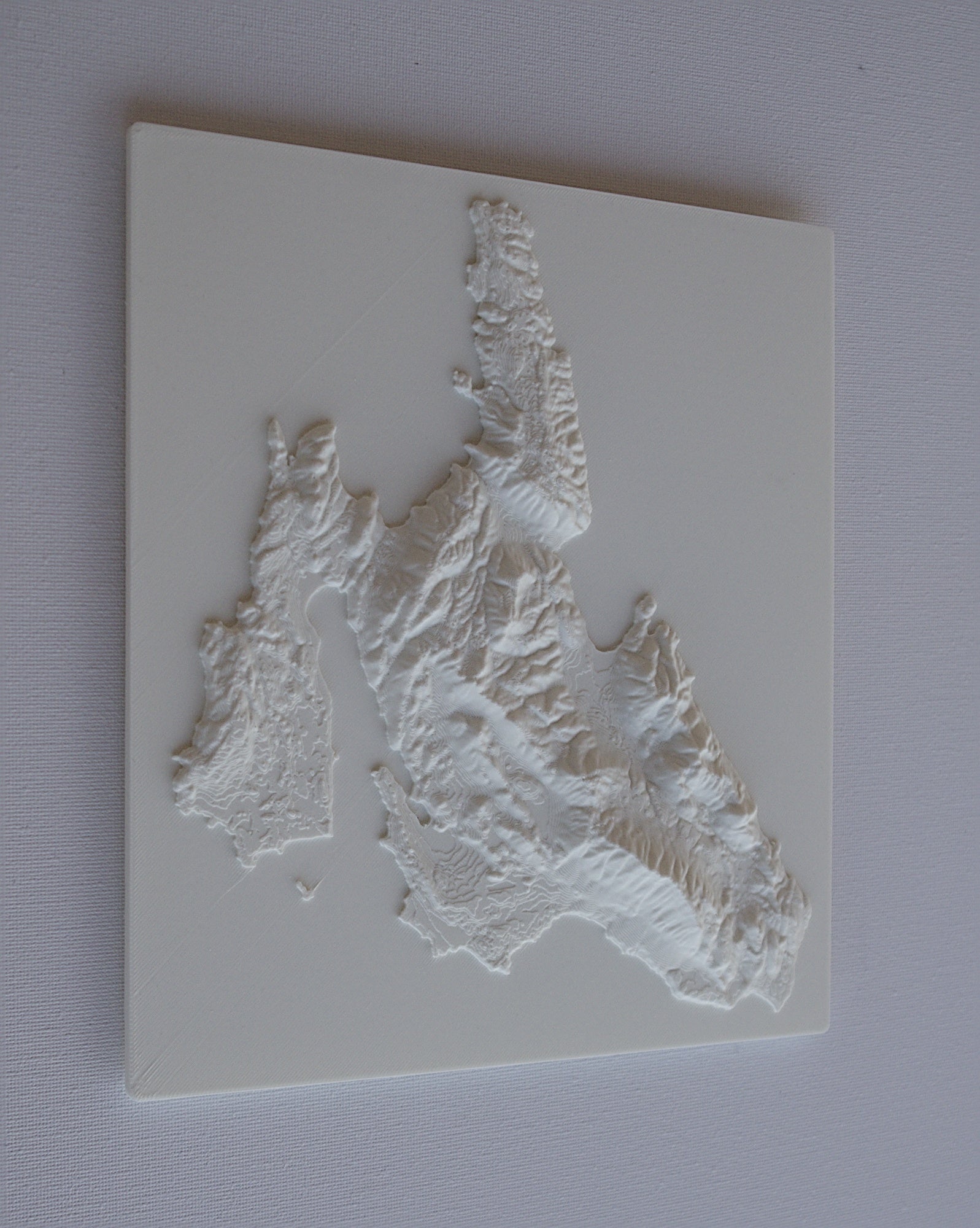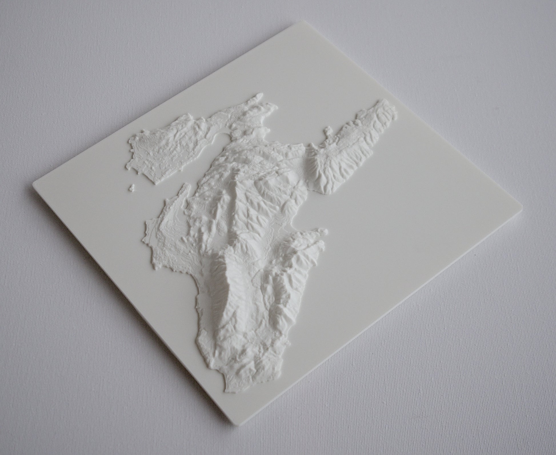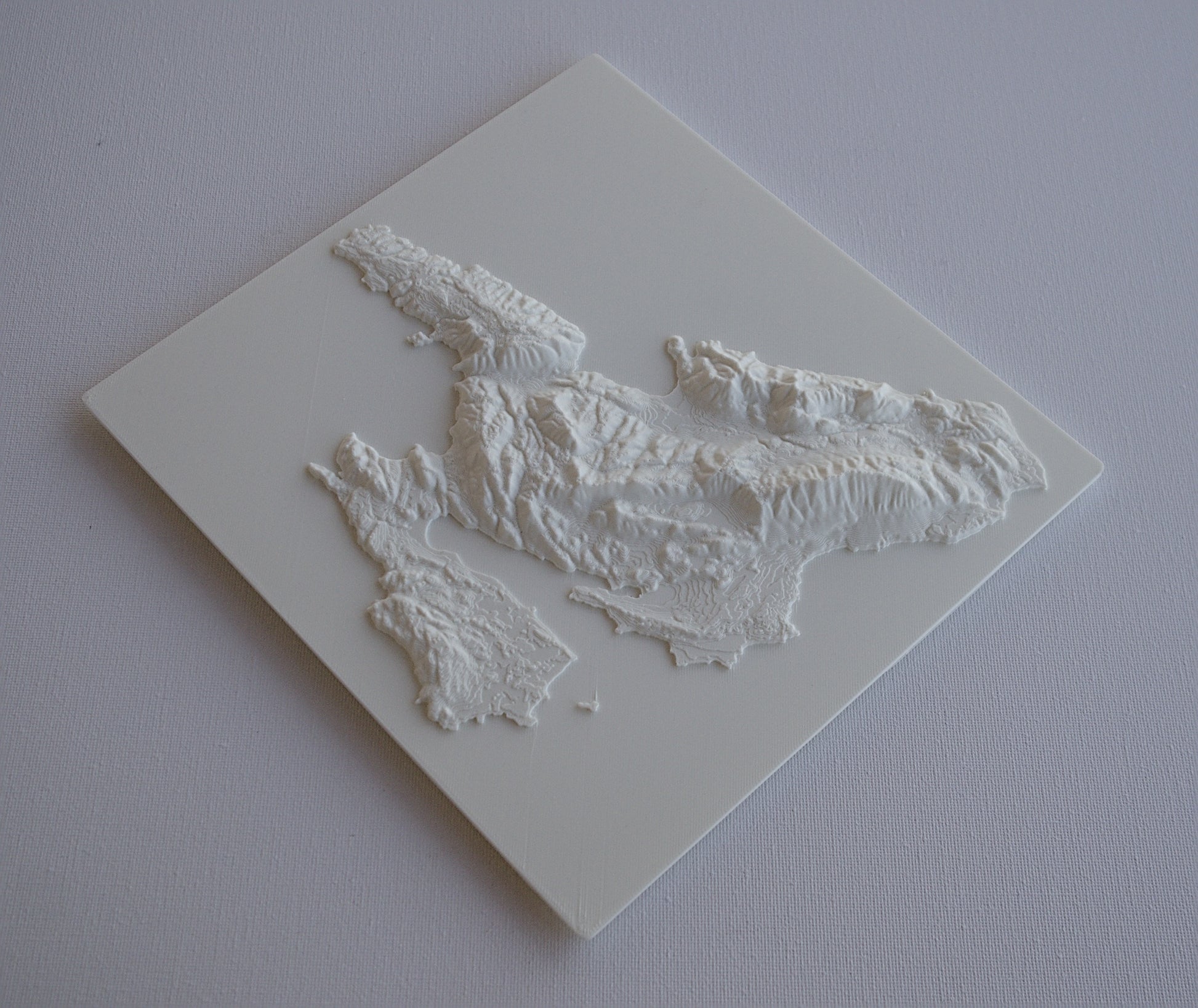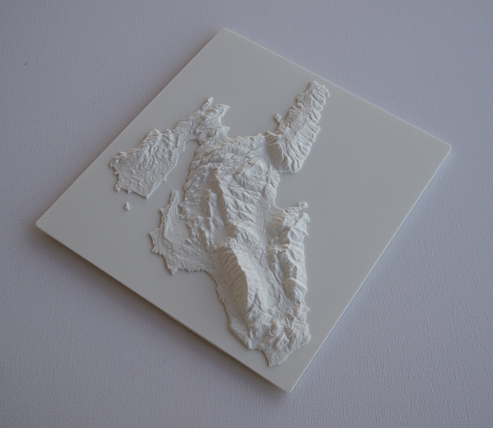 3D printed wall hanging geographical model of cephalonia with a custom attachment for easy wall mounting.