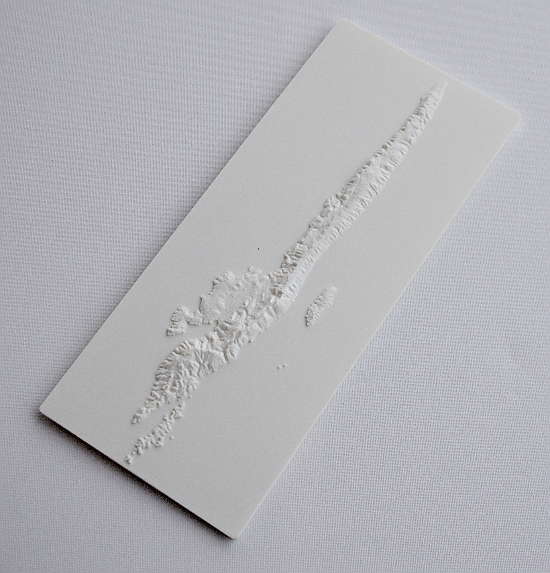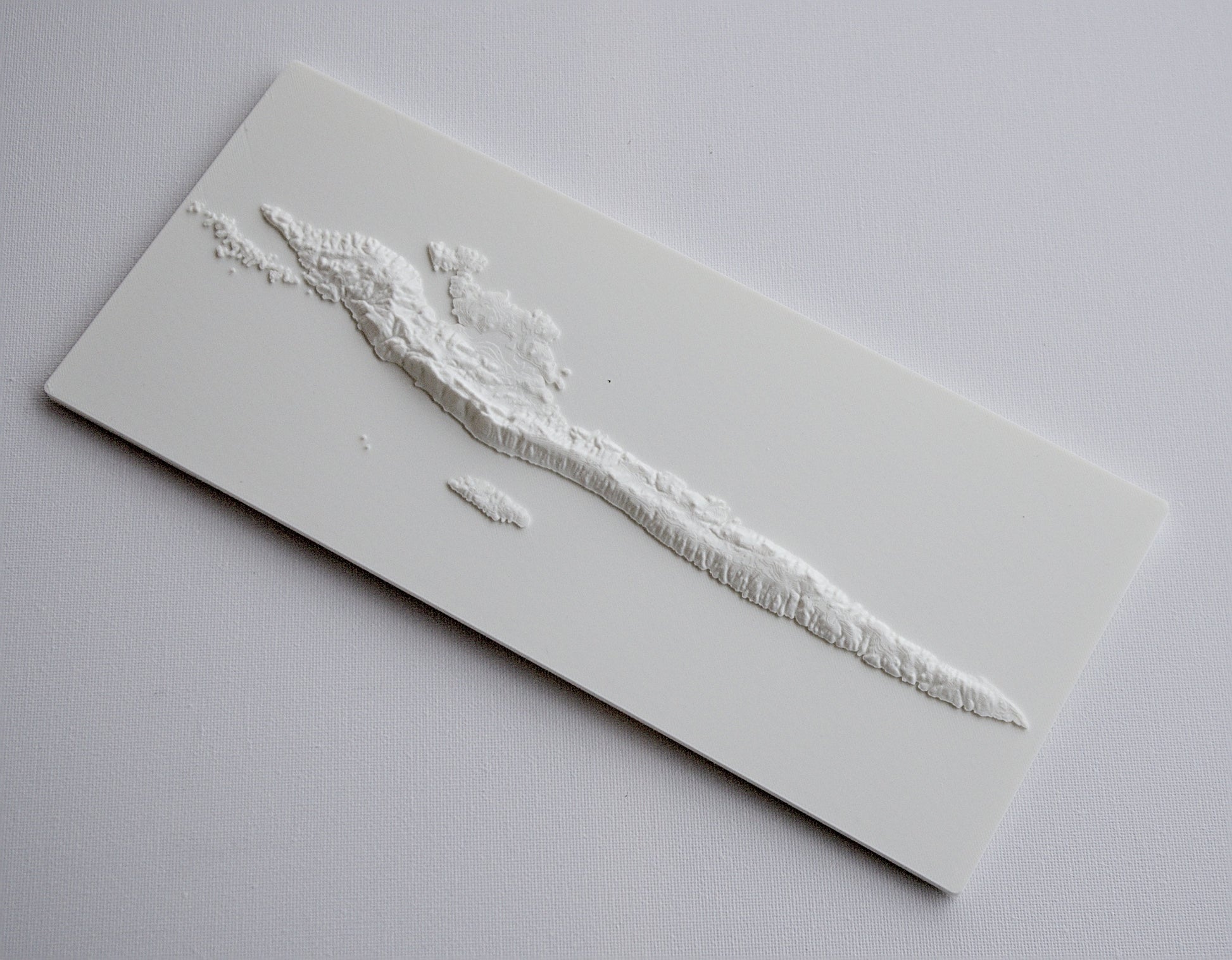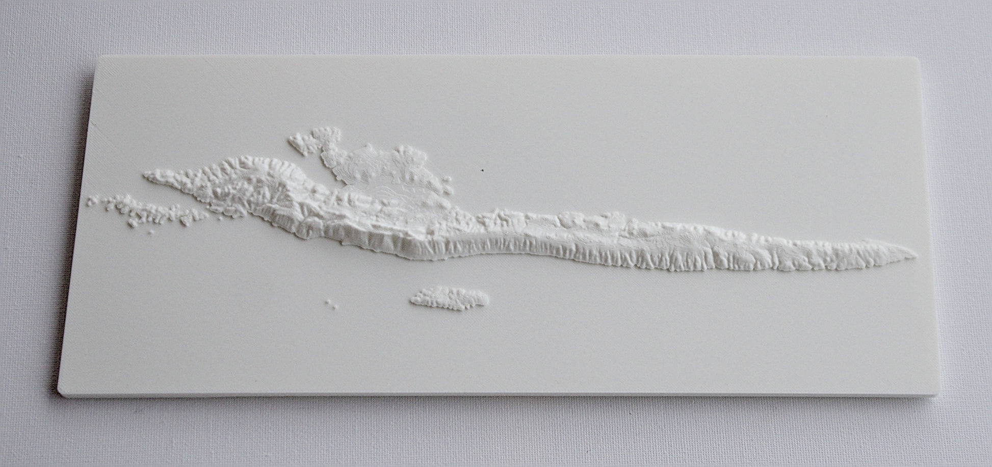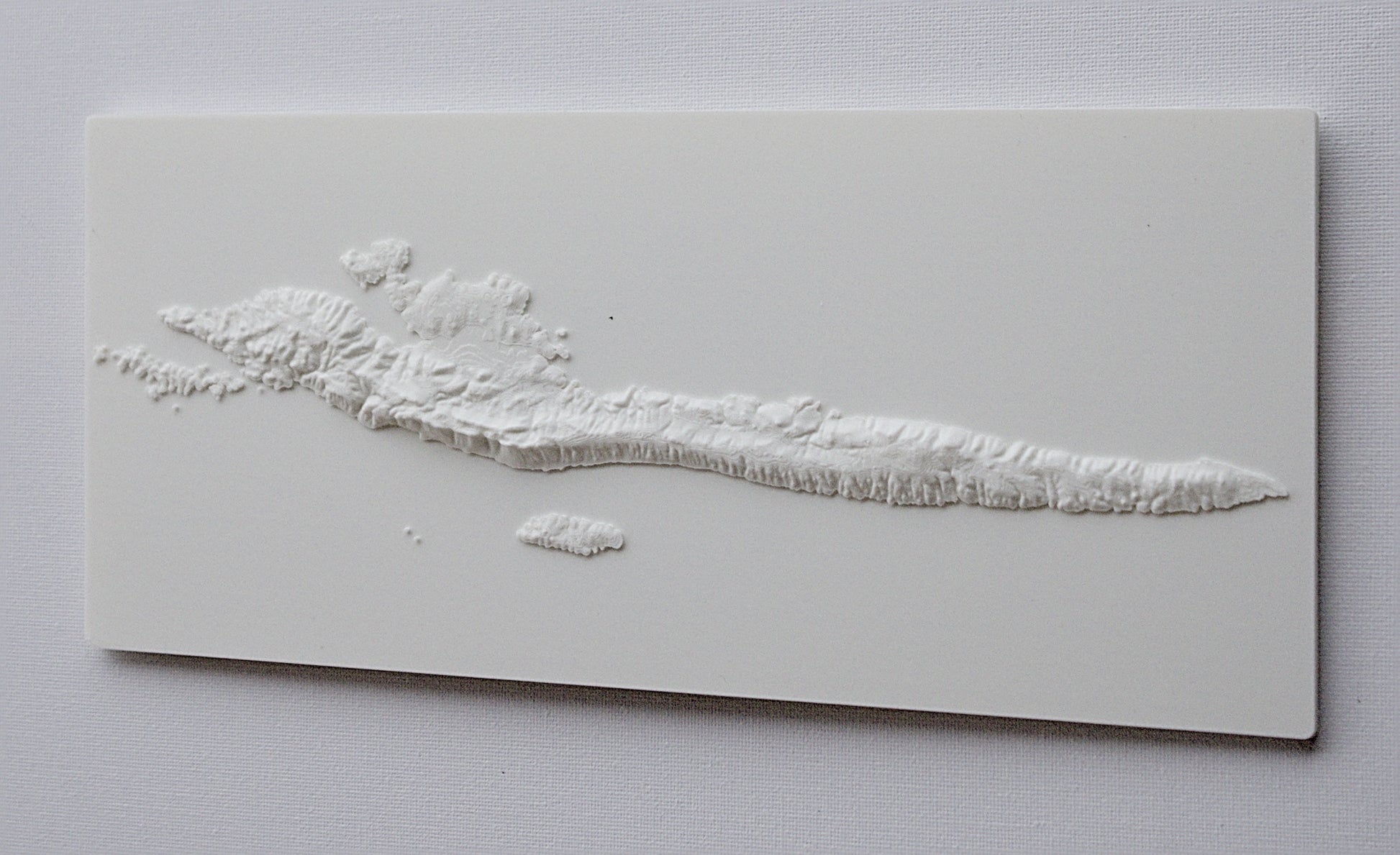 3D printed wall hanging geographical model of Hvar with a custom attachment for easy wall mounting.