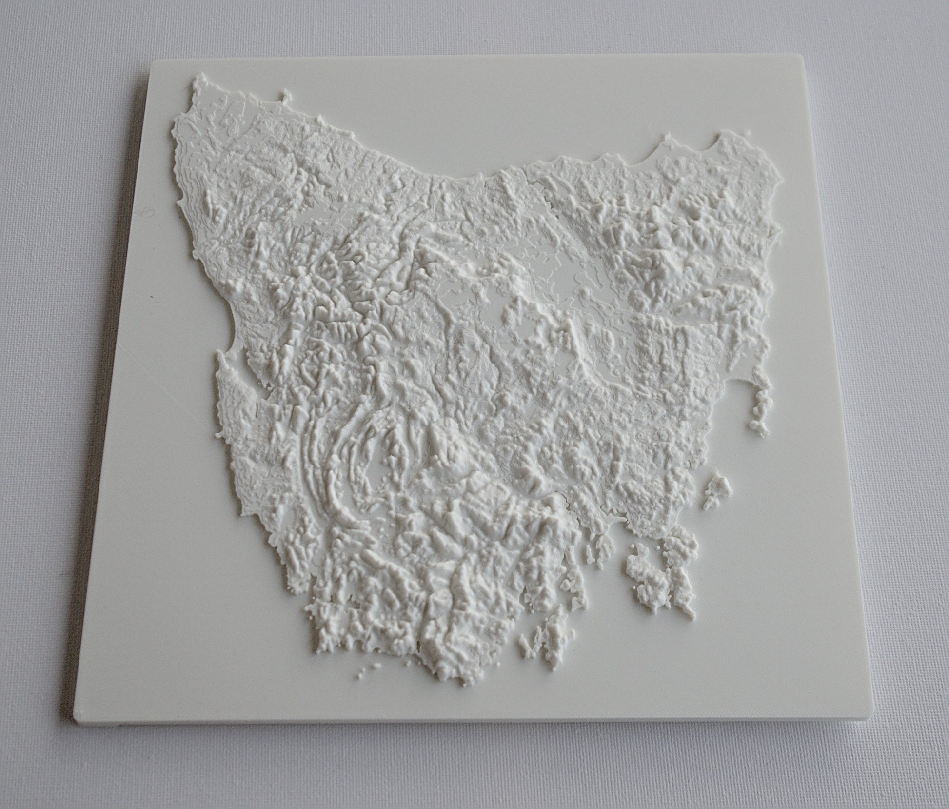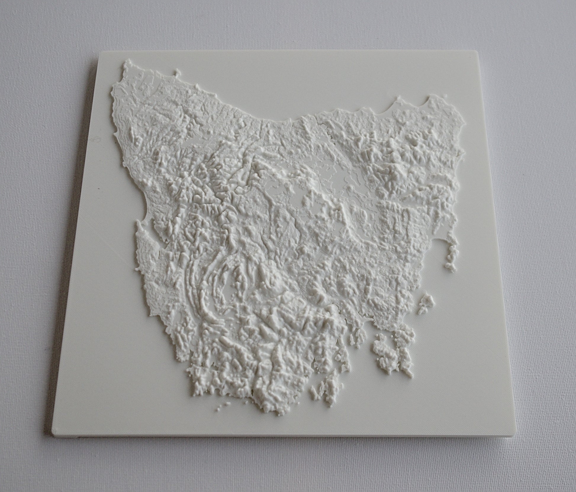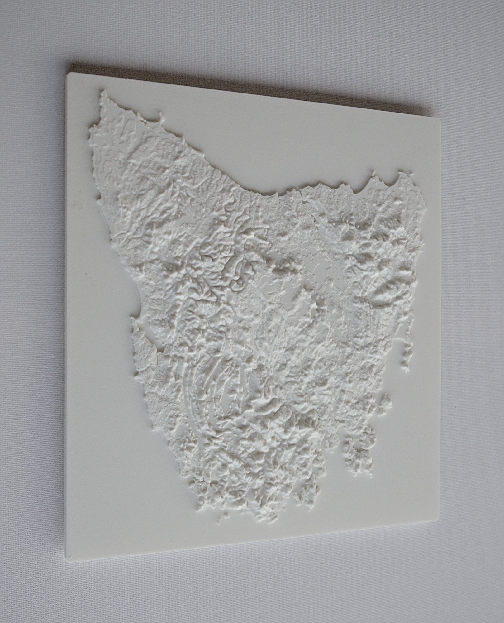 3D printed wall hanging geographical model of Tasmania with a custom attachment for easy wall mounting.