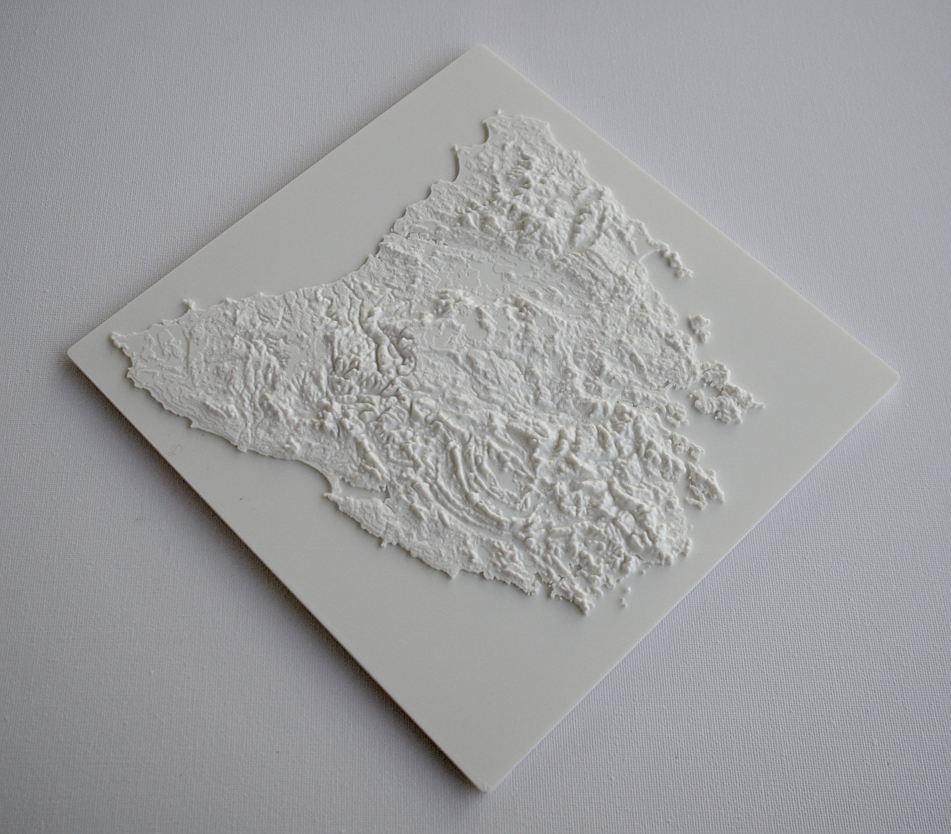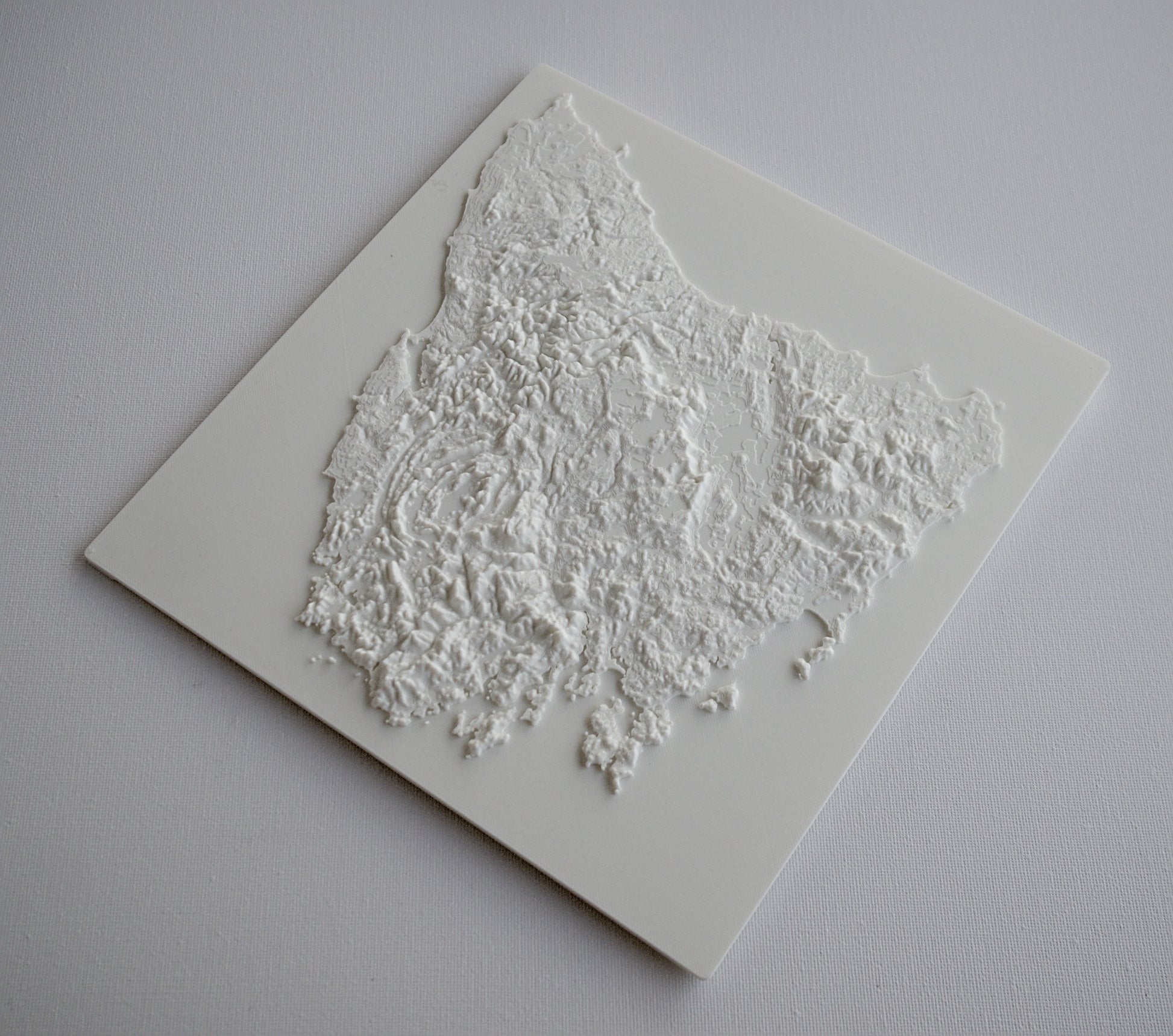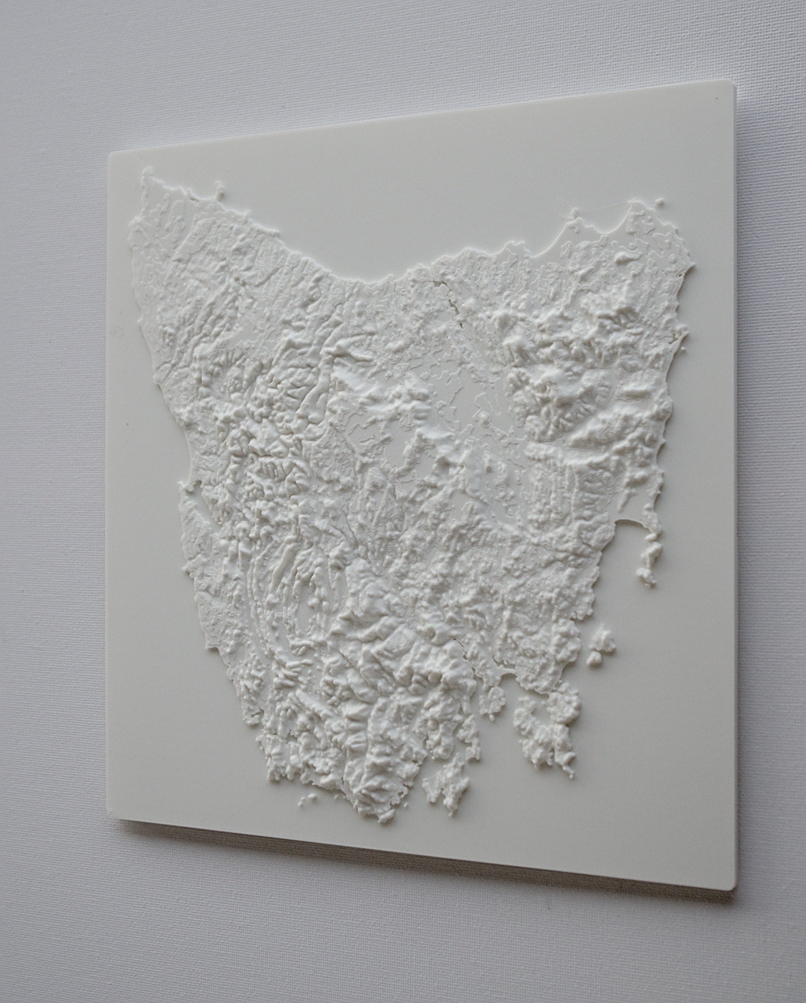 3D printed wall hanging geographical model of Tasmania with a custom attachment for easy wall mounting.